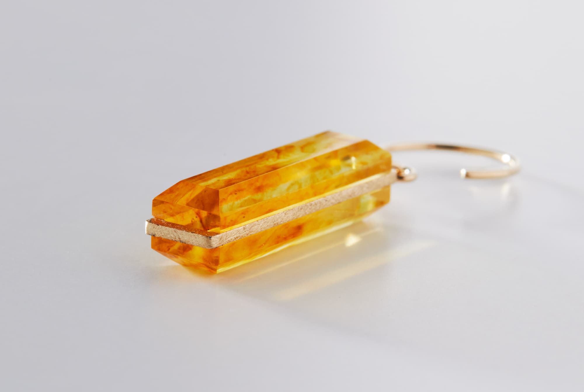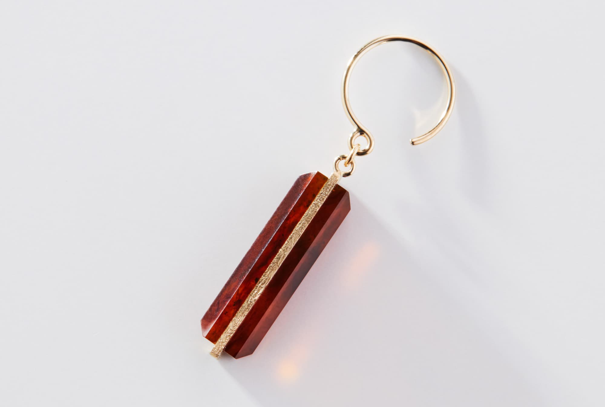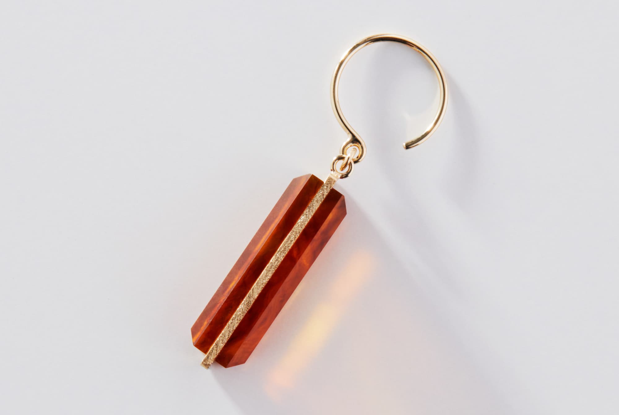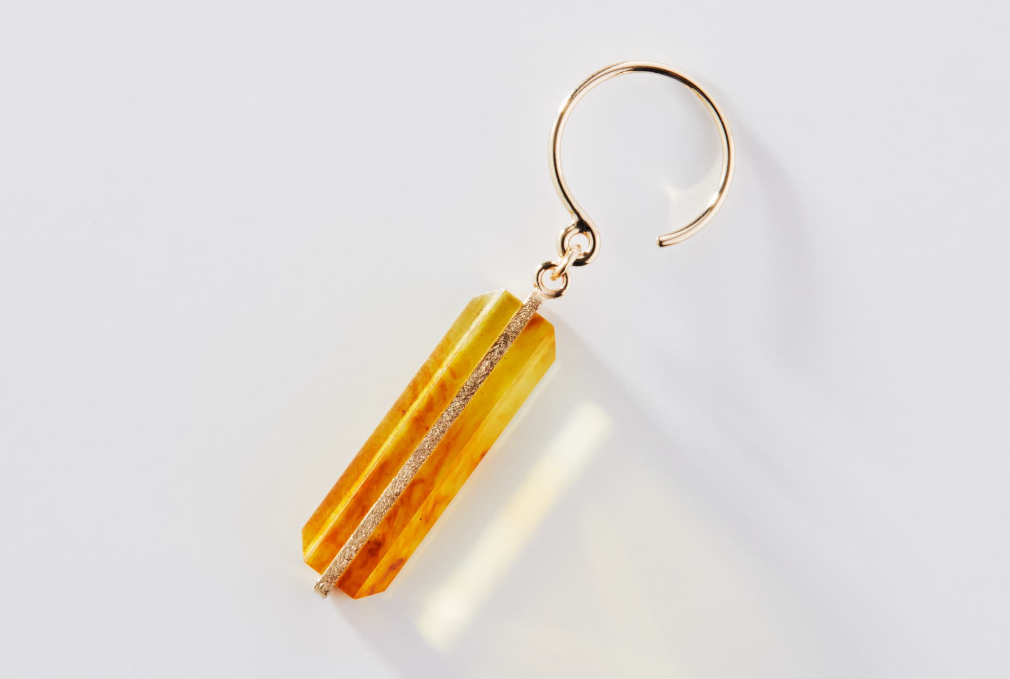 スクエア型の『リファインドアンバー』とゴールドのフープ型ピアスのロングサイズ。